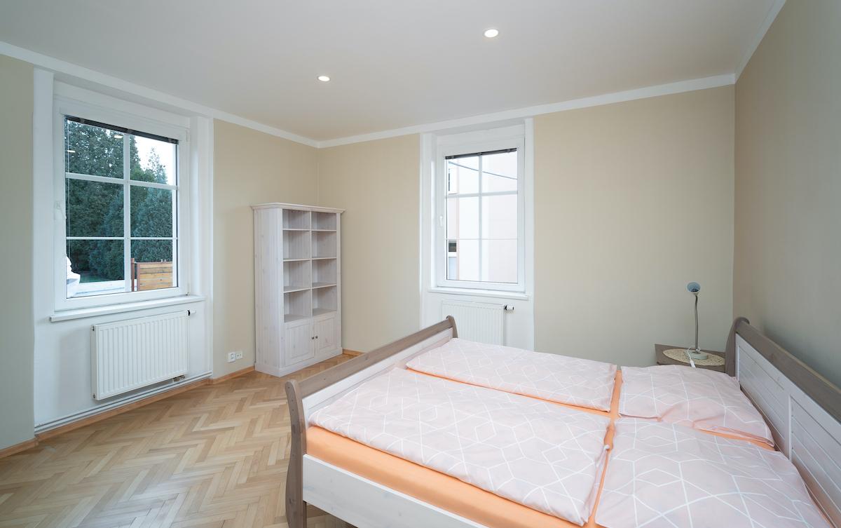 Prostorný apartmán s 2 ložnicemi (1 manželská postel 180x200 cm, 2 postele 90x200 cm), kompletně zařízenou kuchyní, samostatným obývacím pokojem, koupelnou s WC a zimní zahradou s posezením. Přímý vstup do zahrady.