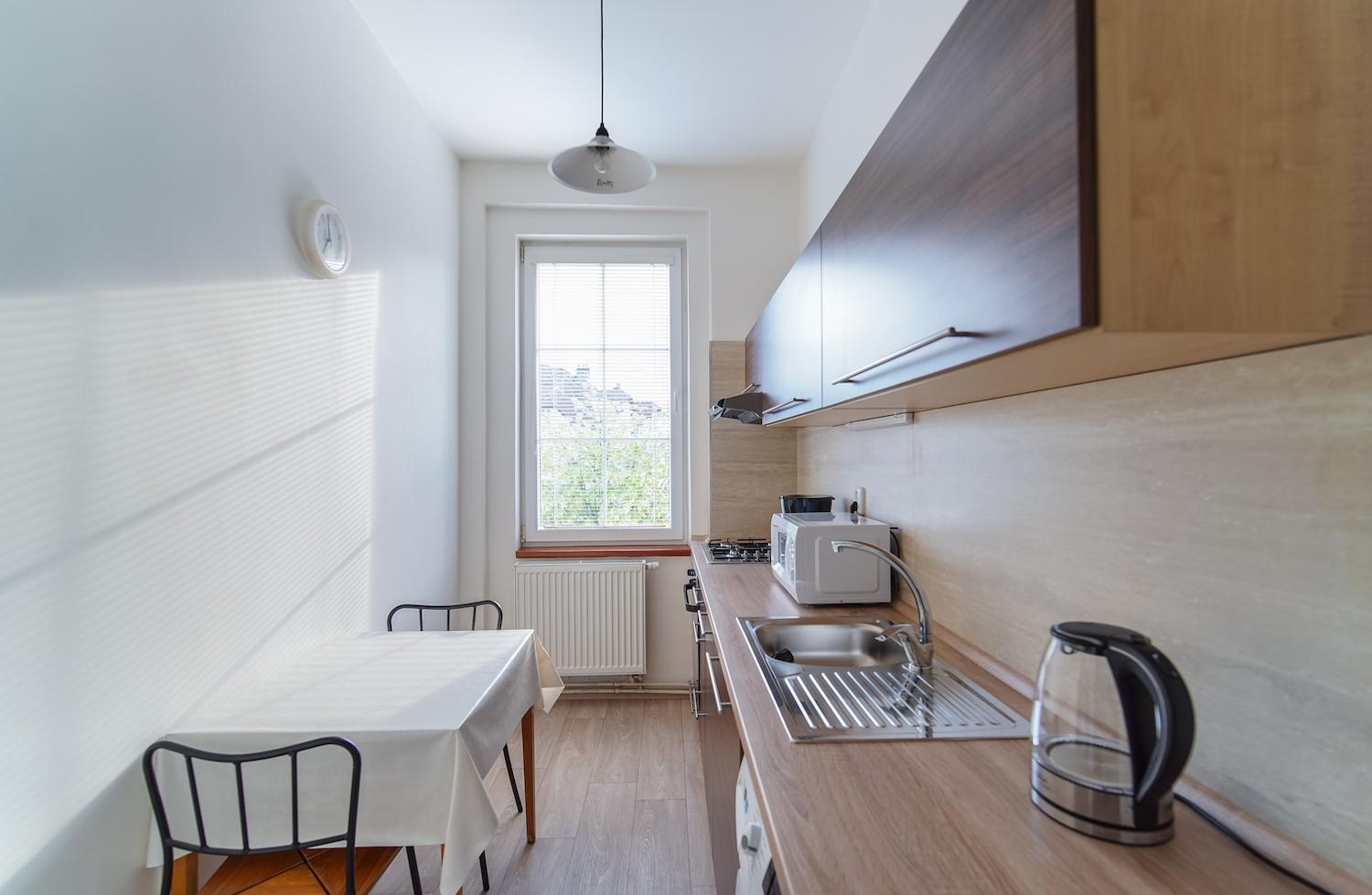 Prostorný apartmán s 2 ložnicemi (1 manželská postel 180x200 cm, 2 postele 90x200 cm), kompletně zařízenou kuchyní, samostatným obývacím pokojem, koupelnou s wc a letní terasou s posezením.