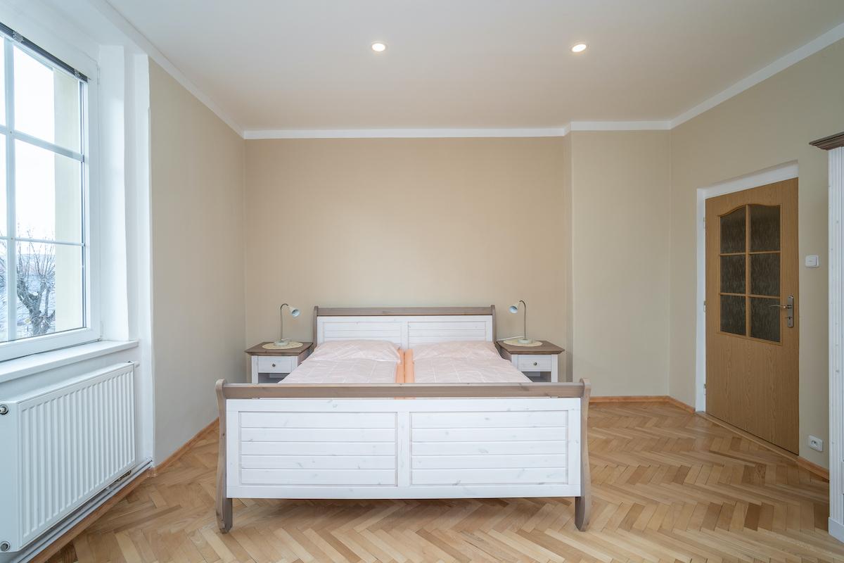 Prostorný apartmán s 2 ložnicemi (1 manželská postel 180x200 cm, 2 postele 90x200 cm), kompletně zařízenou kuchyní, samostatným obývacím pokojem, koupelnou s WC a zimní zahradou s posezením. Přímý vstup do zahrady.